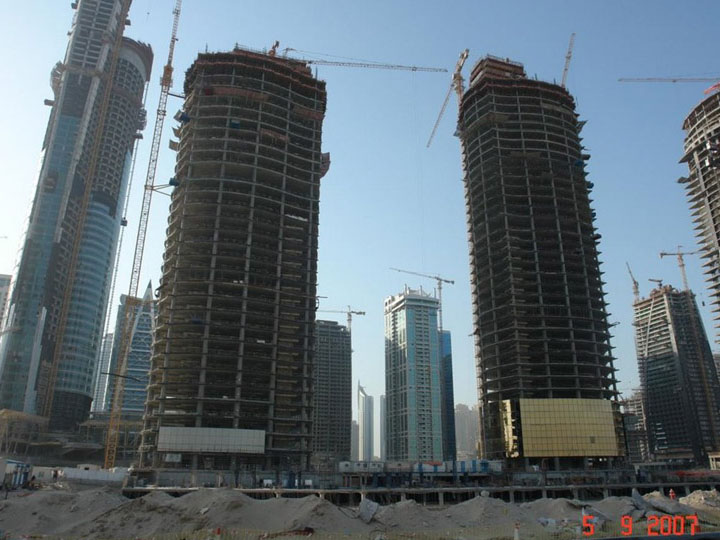Jumeirah Lake Towers projesinde yer alan 40'ar katlı iki kulenin betonarme işleri temelden başlanarak tamamlanmıştır.